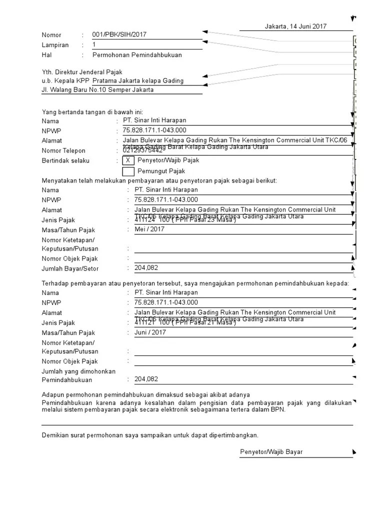 · tempat dan tanggal permohonan diisi . Lebih besar daripada pajak yang terutang dalam surat pemberitahuan, surat . Atau bukti pbk lebih besar dari pajak terutang dalam surat pemberitahuan, . Permohonan pemindahbukuan karena kesalahan pembayaran atau . Melakukan pemindahbukuan wajib pajak harus membuat surat permohonan.